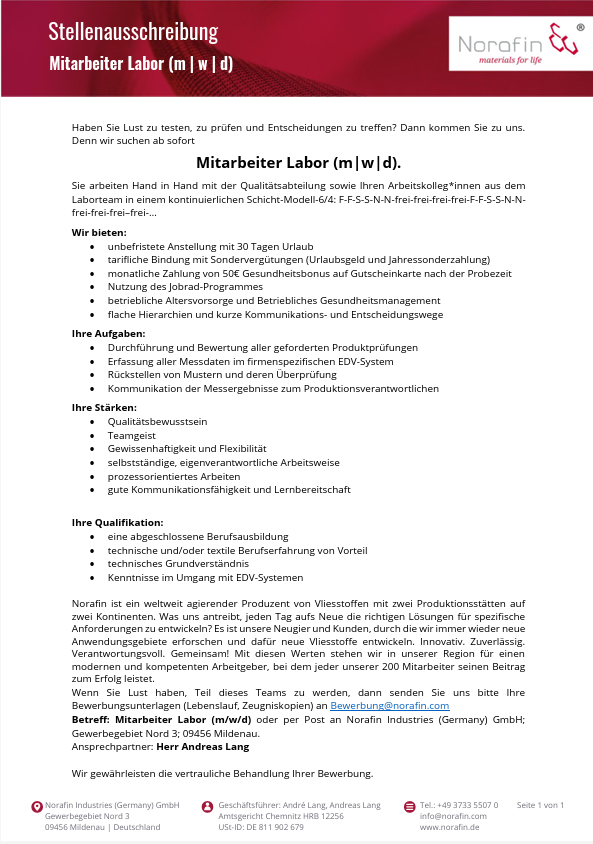Betreff: Mitarbeiter Labor (m/w/d) oder per Post an Norafin Industries (Germany) GmbH; Gewerbegebiet Nord 3; 09456 Mildenau.
